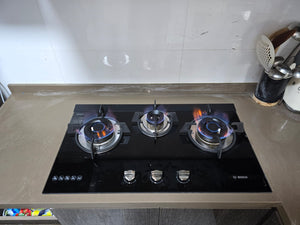 The Bosch PMD83D31AF is a sleek 76 cm tempered glass hob with three high-performance brass burners, including a powerful 4.9 kW wok burner. It features electric ignition via ergonomic knobs, flame-failure safety, enamel pan supports, and an elegant frameless glass design—ideal for efficient, stylish everyday cooking.