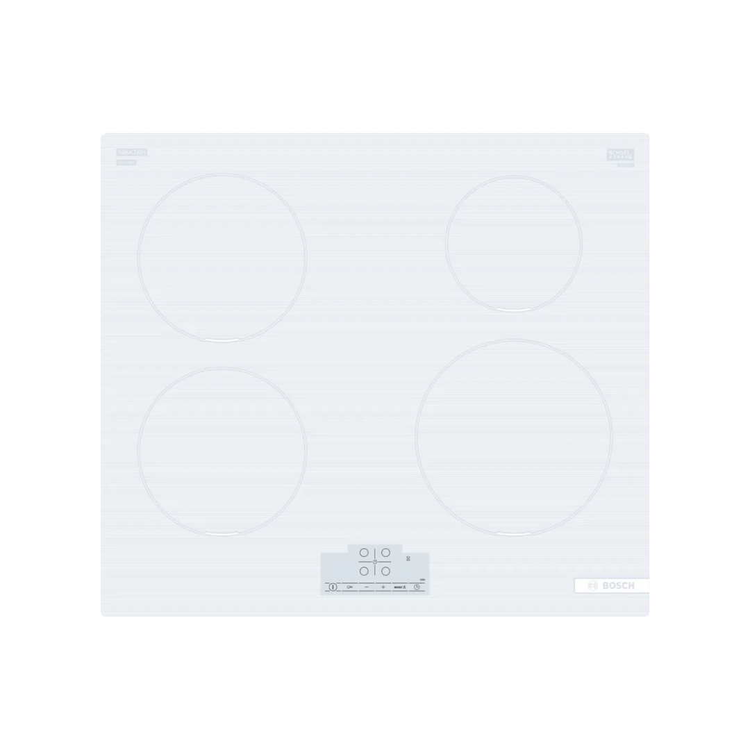 The BOSCH PUE612BB1J is a sleek 60cm frameless induction hob with four powerful burners, 17 heat levels, and TouchControl. Finished in azurish white glass ceramic, it offers flexible round zones, PowerBoost for faster cooking, and precise timers—perfect for modern kitchens demanding performance, efficiency, and style.