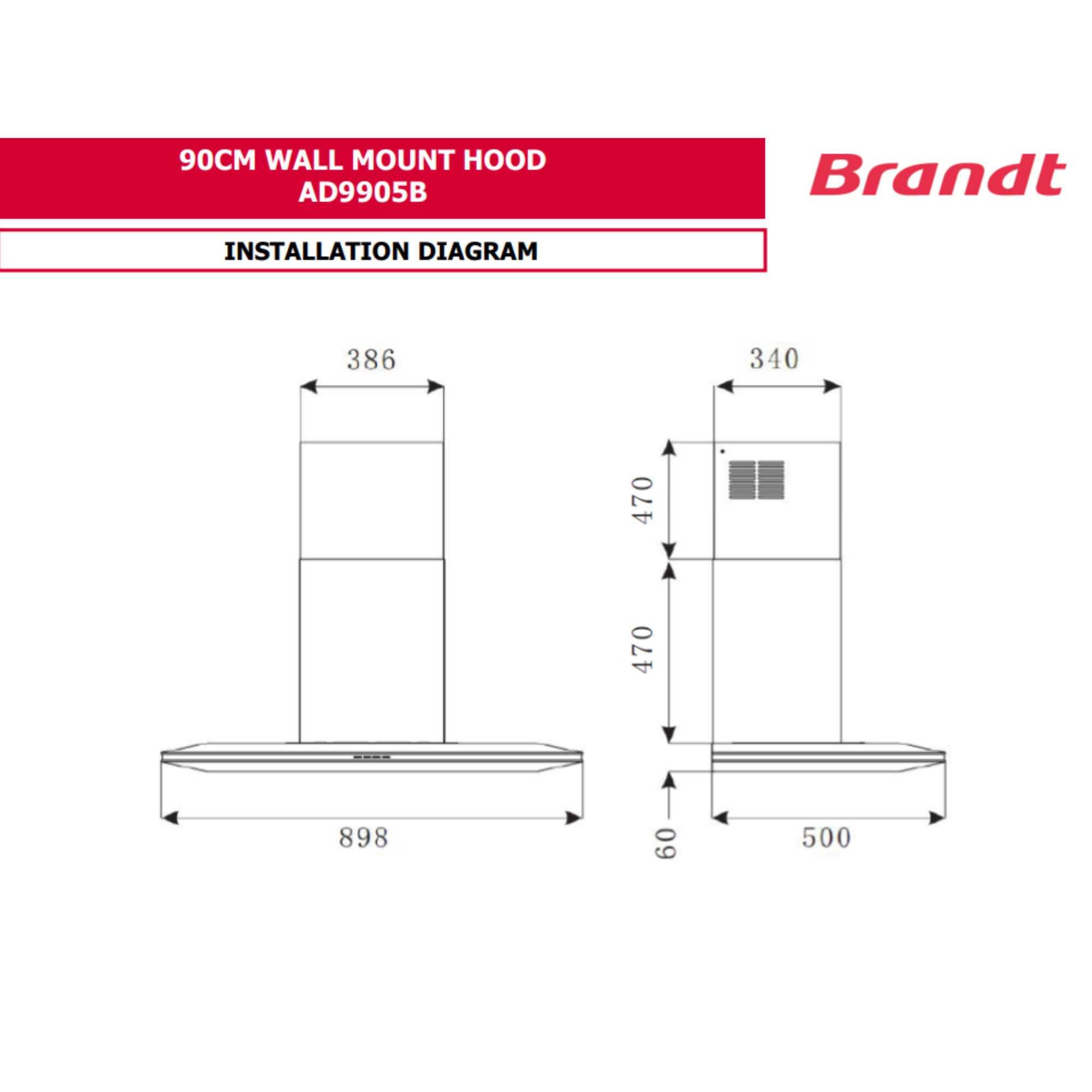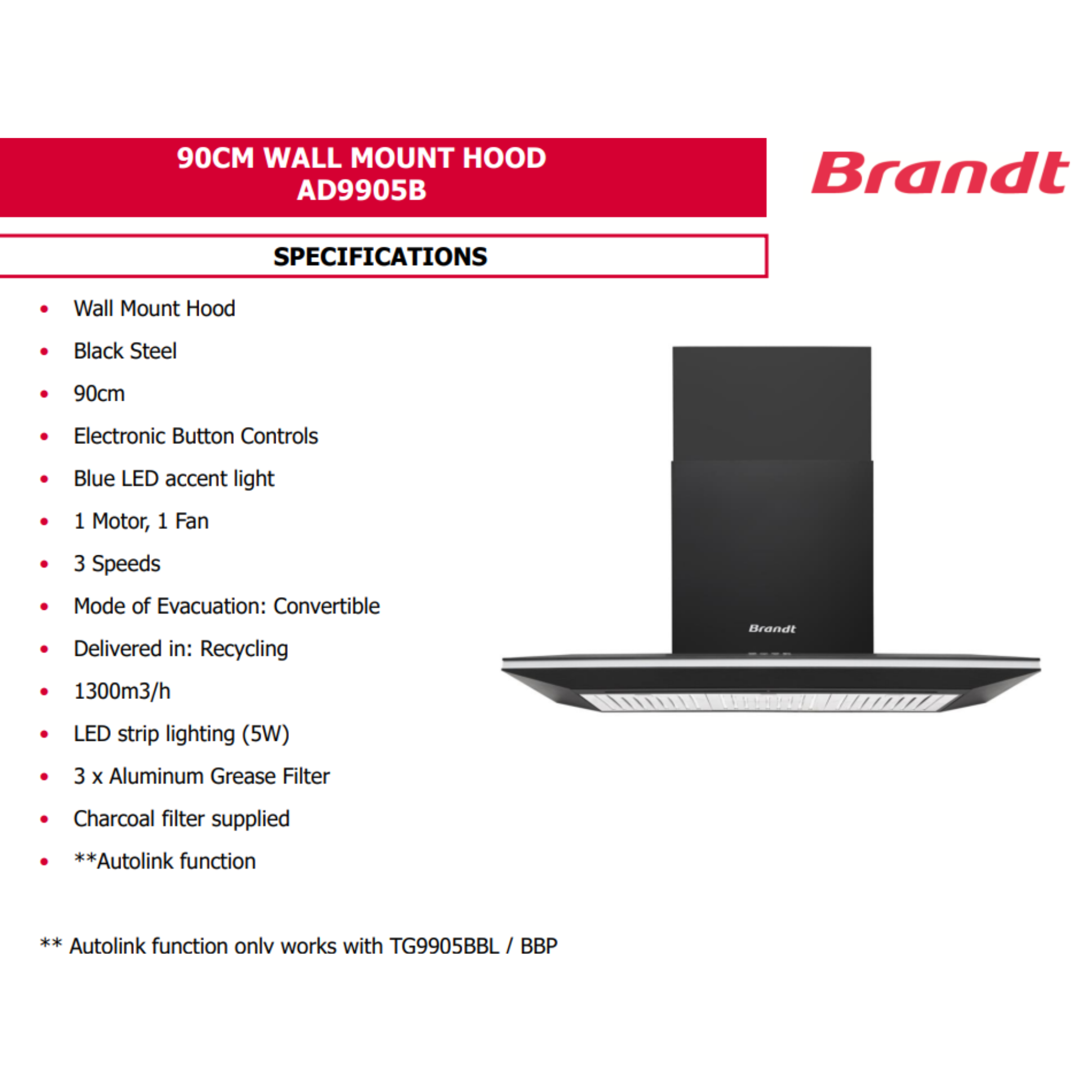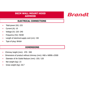 The Brandt AD9905B is a 90cm stainless steel wall-mounted hood designed for powerful and quiet extraction. Its modern design complements any kitchen, while efficient airflow removes smoke and odors with ease. Features include multiple speed settings, LED lighting, and easy-to-clean filters—perfect for a fresh, stylish cooking space.