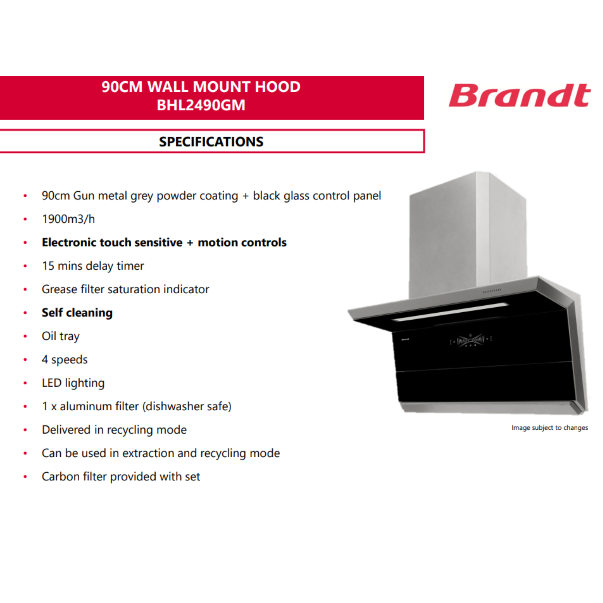 Upgrade your kitchen with the Brandt BHL2490GM 90 cm chimney hood, featuring a sleek gun-metal grey powder-coated finish and black glass touch panel. With high-power 1,900 m³/h airflow, four suction speeds, electronic touch + motion controls, a 15-minute delay timer and self-cleaning function, it effortlessly clears smoke and grease for a cleaner, fresher kitchen.