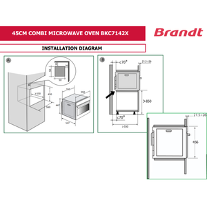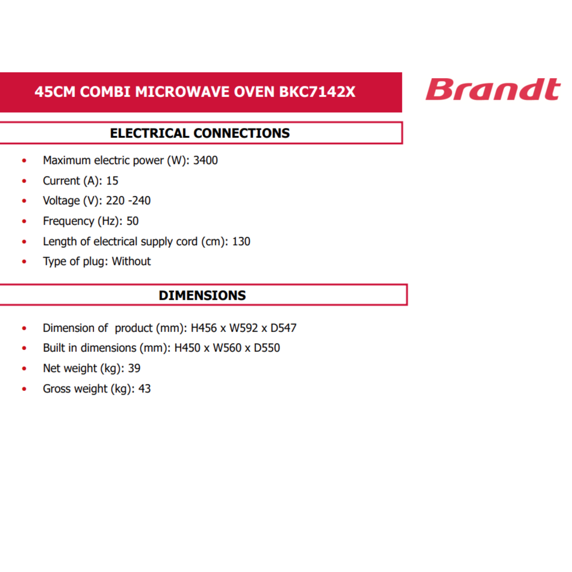 Experience versatile cooking with the Brandt BKC7142LX 40L Built-In Microwave Oven. Its spacious capacity and powerful performance make it ideal for reheating, defrosting, and preparing meals with ease. The sleek stainless-steel design enhances any kitchen, while intuitive controls ensure user-friendly operation. A perfect blend of style, efficiency, and everyday convenience.