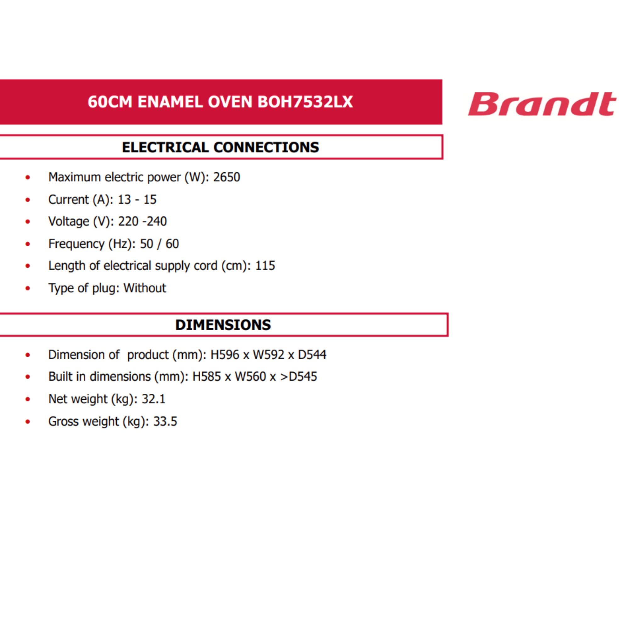 Built in dimensions (HxWxD): 585 x 560 x >545mm