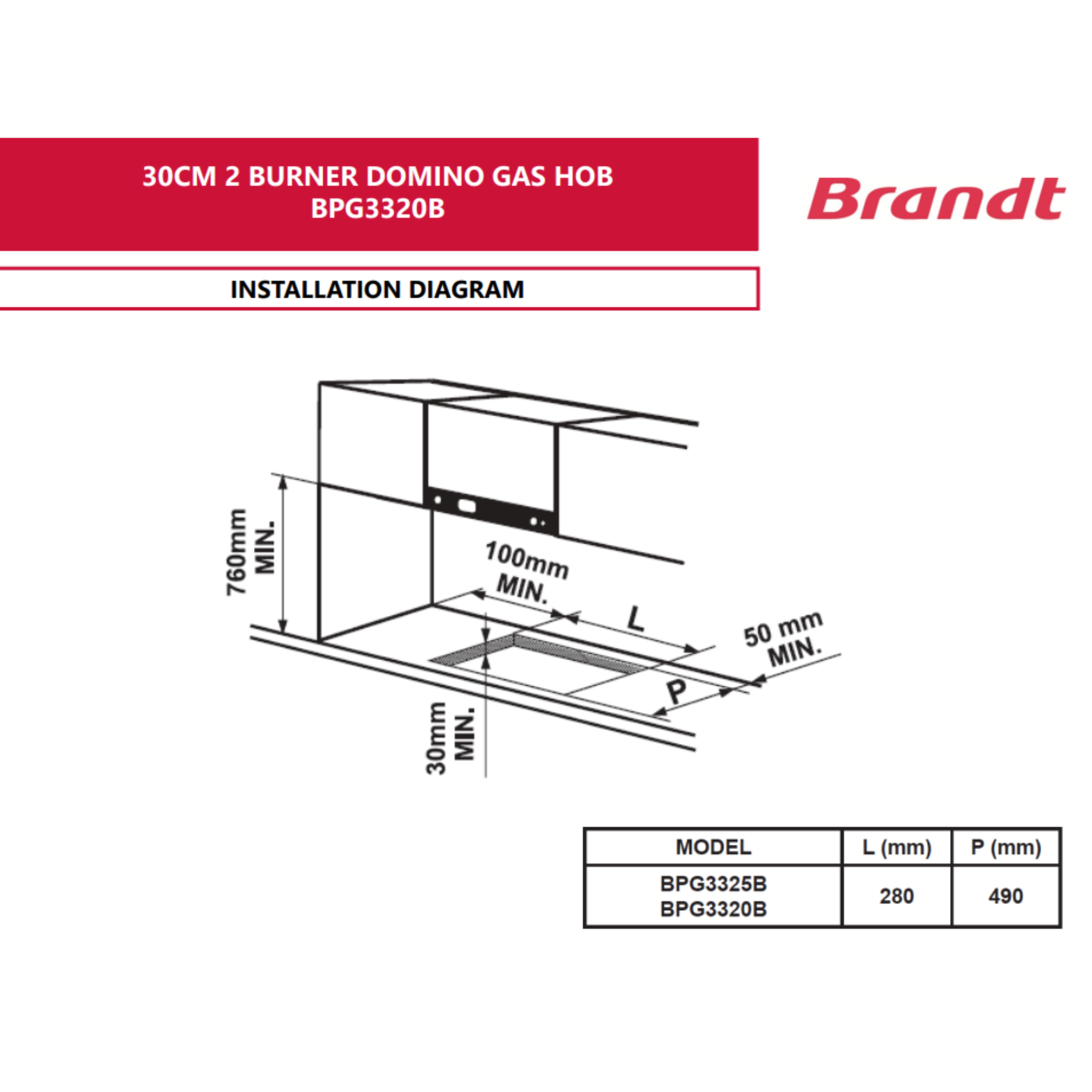 Brandt BPG3320B - 30cm Tempered Glass Gas Hob 2 Burners