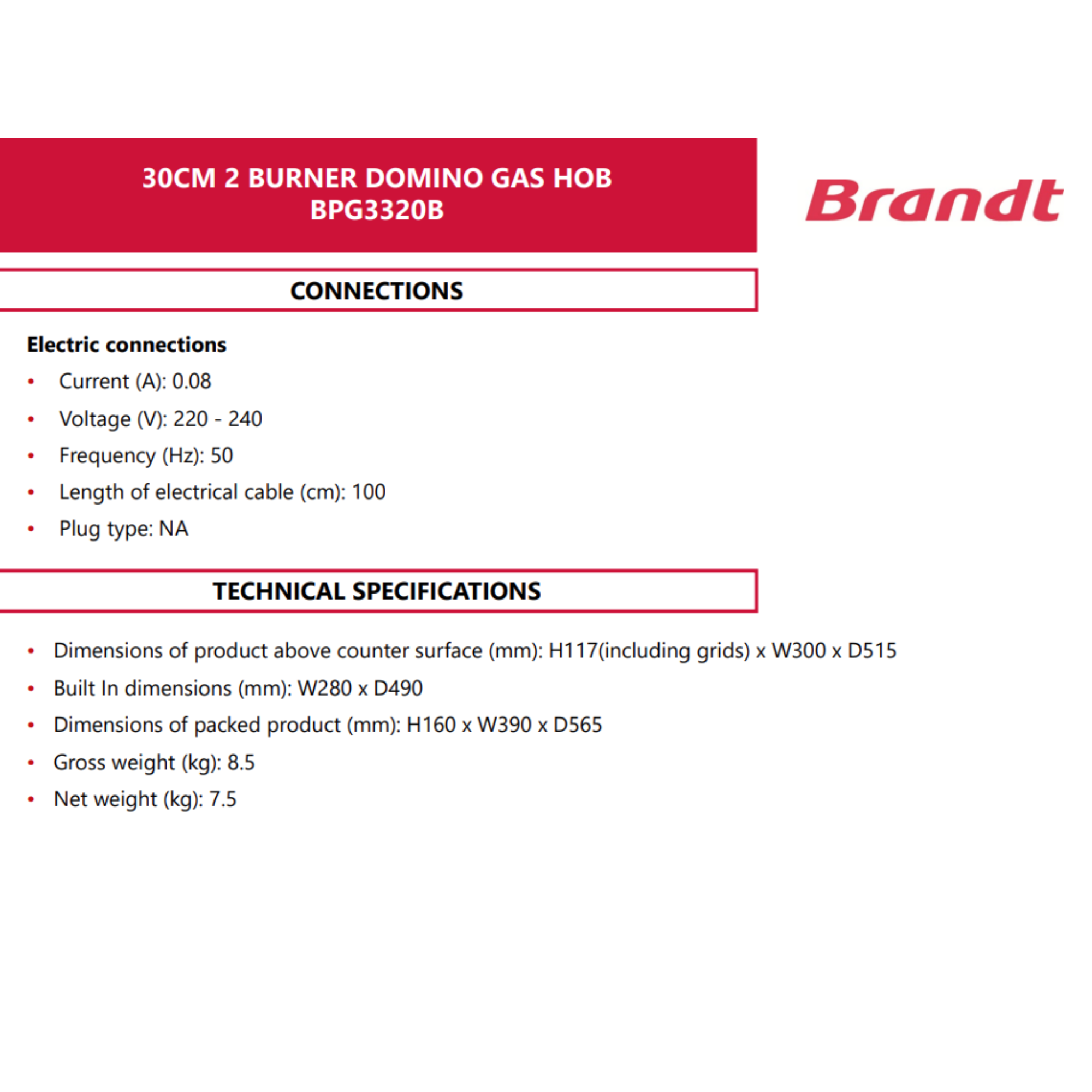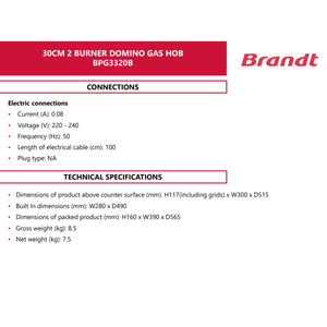 The Brandt BPG3320B 30 cm Domino Gas Hob features a sleek vitroceramic glass surface, brass burners, and dual cast-iron pan supports. With thermocouple flame-failure safety and total power of 4.75 kW, its two front knob controls ensure reliable, safe, and efficient cooking.