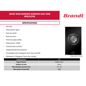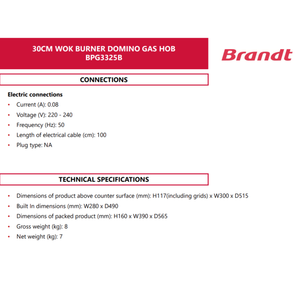 The Brandt BPG3325B 30 cm Domino Gas Hob features a powerful 5.0 kW wok burner, sleek vitroceramic glass surface, brass burner, and robust cast-iron pan support. Front knob controls incorporate thermocouple flame-failure safety and integrated electric ignition. Ideal for compact kitchens, perfect for high-heat culinary tasks.