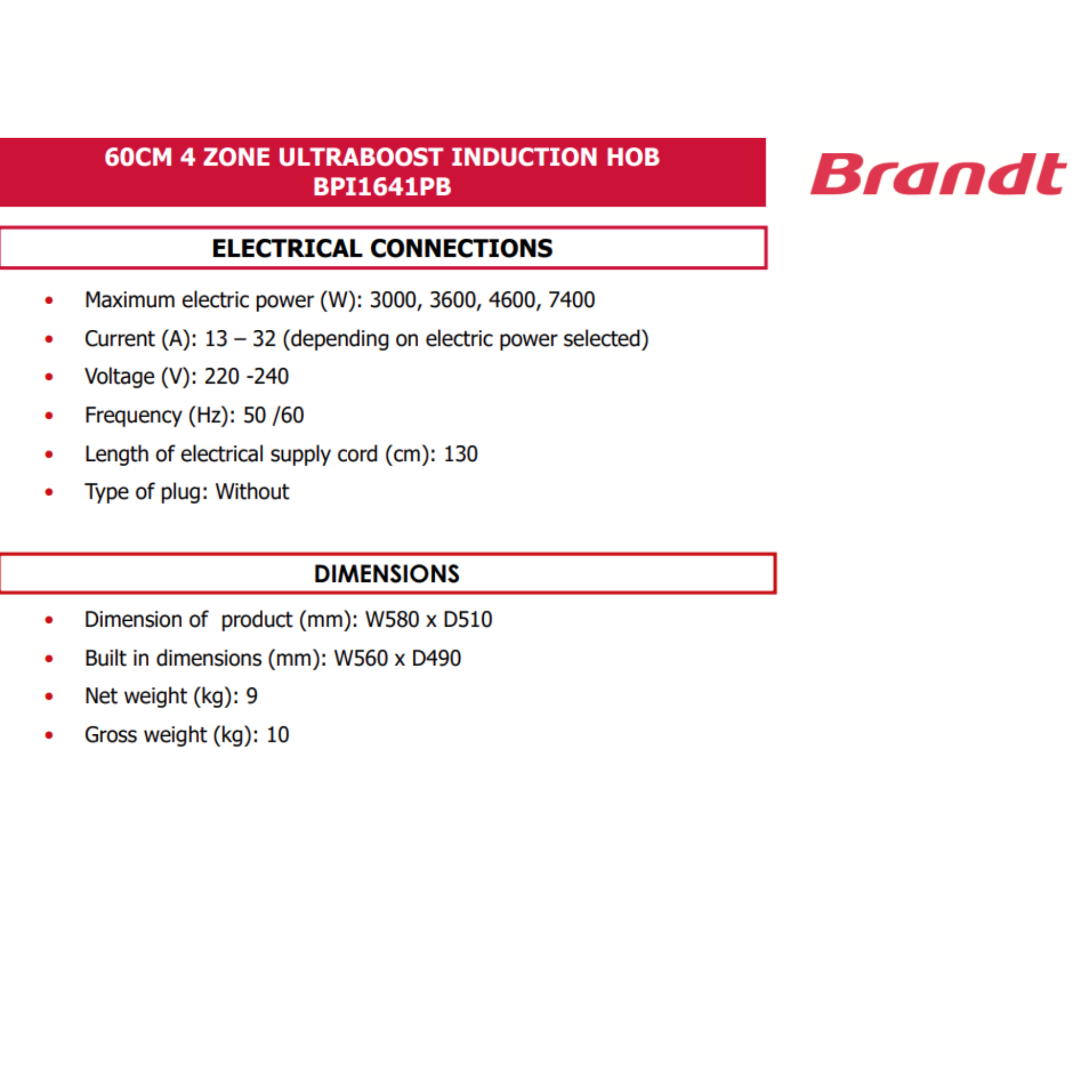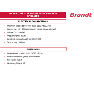 The Brandt BPI1641PB 58cm Induction Hob delivers versatile cooking power with four high-performance burners. Featuring rapid heat technology, precise touch controls, and energy-efficient operation, it ensures perfect results every time. Its sleek black glass finish, easy-clean surface, and modern design make it a stylish and practical addition to any contemporary kitchen.