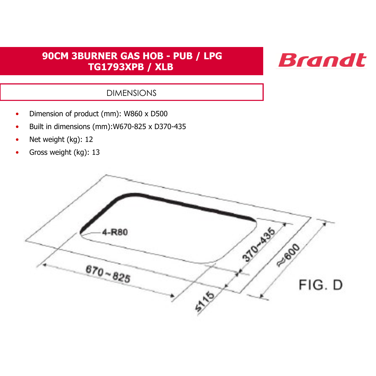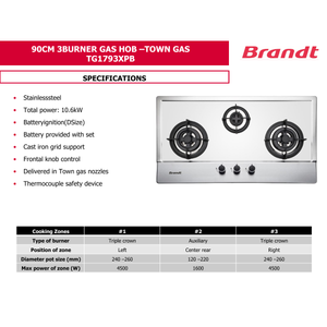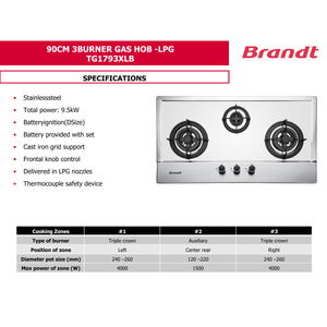 The Brandt 90cm gas hob features 3 burners with a total power of 10.6 kW (town gas) and 9.5 kW (LPG (Cylinder/Tank)). It has a stainless steel surface, battery-operated ignition, and a thermocouple safety device. Supplied with town gas or LPG (Cylinder/Tank) nozzles, it offers easy installation with adjustable sizing for various cutouts.