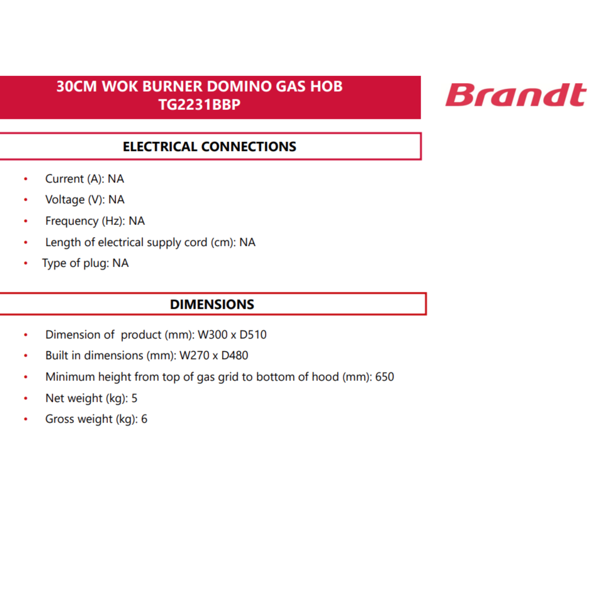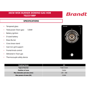 Brandt TG2231 - 30cm Tempered Glass Gas Hob 1 Burner