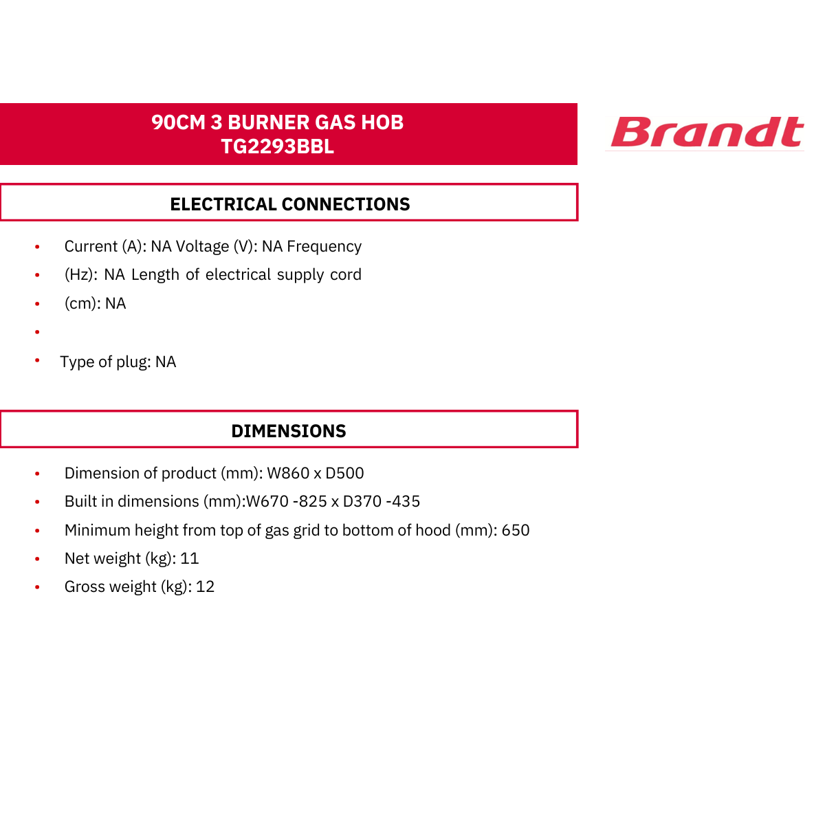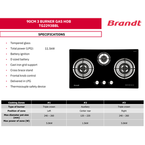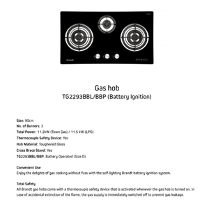 Experience premium cooking with the Brandt TG2293BBP / BBL 86 cm 3-burner glass gas hob. Featuring SCHOTT tempered glass, battery ignition, thermocouple safety shut-off, and 11.5 kW total power (LPG), it ensures efficient, safe and elegant performance. The cast-iron pan supports and triple-crown burner deliver stable, high-heat cooking.