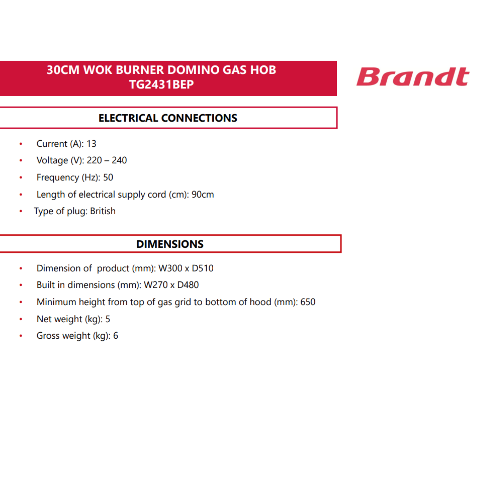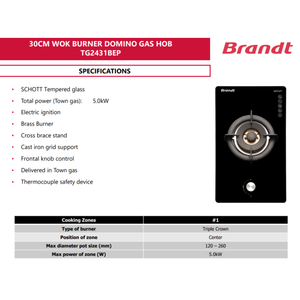 The Brandt TG2431 is a compact 30 cm domino gas hob with 1 triple-ring burner, delivering 4.8 kW (town gas) / 5.0 kW (LPG). Featuring SCHOTT toughened glass, battery ignition, thermocouple flame safety, cast iron pan support, and a slim 270 × 480 mm cut-out, it’s ideal for small kitchens.