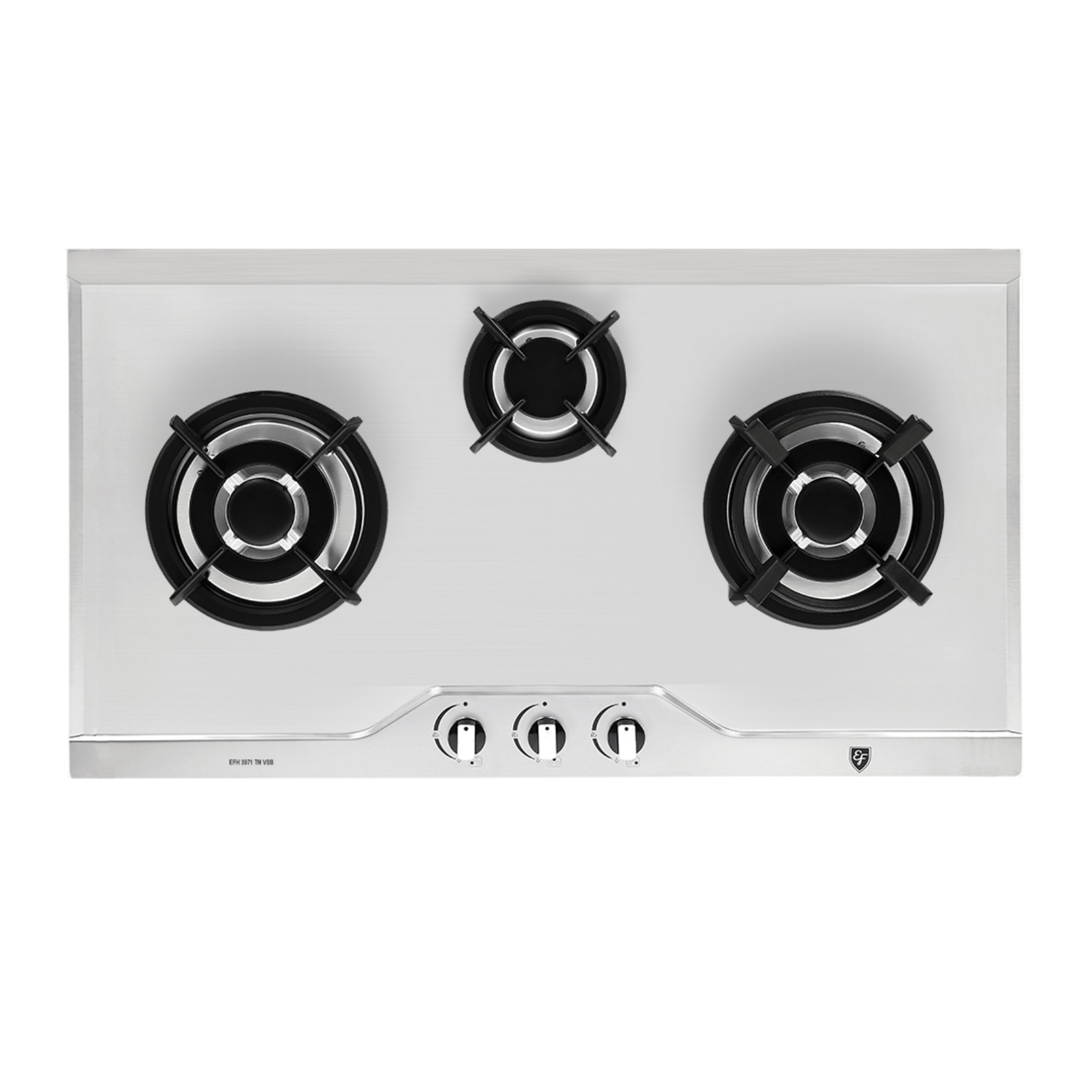 The EF EFH3971TNVSB is an 86cm stainless steel gas hob featuring three high-performance brass burners: a 5.0kW triple-ring burner, a 3.4kW rapid burner, and a 1.75kW semi-rapid burner. It includes battery ignition, flame-failure safety, sealed burner bases, and sturdy cast iron pan supports for safe and powerful cooking.