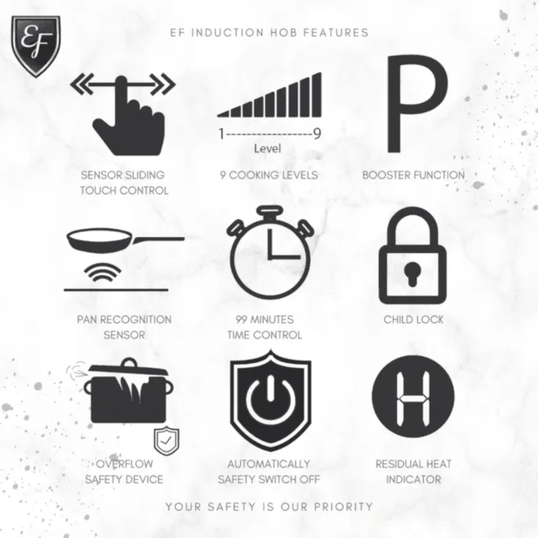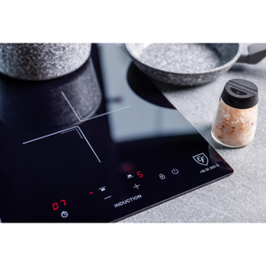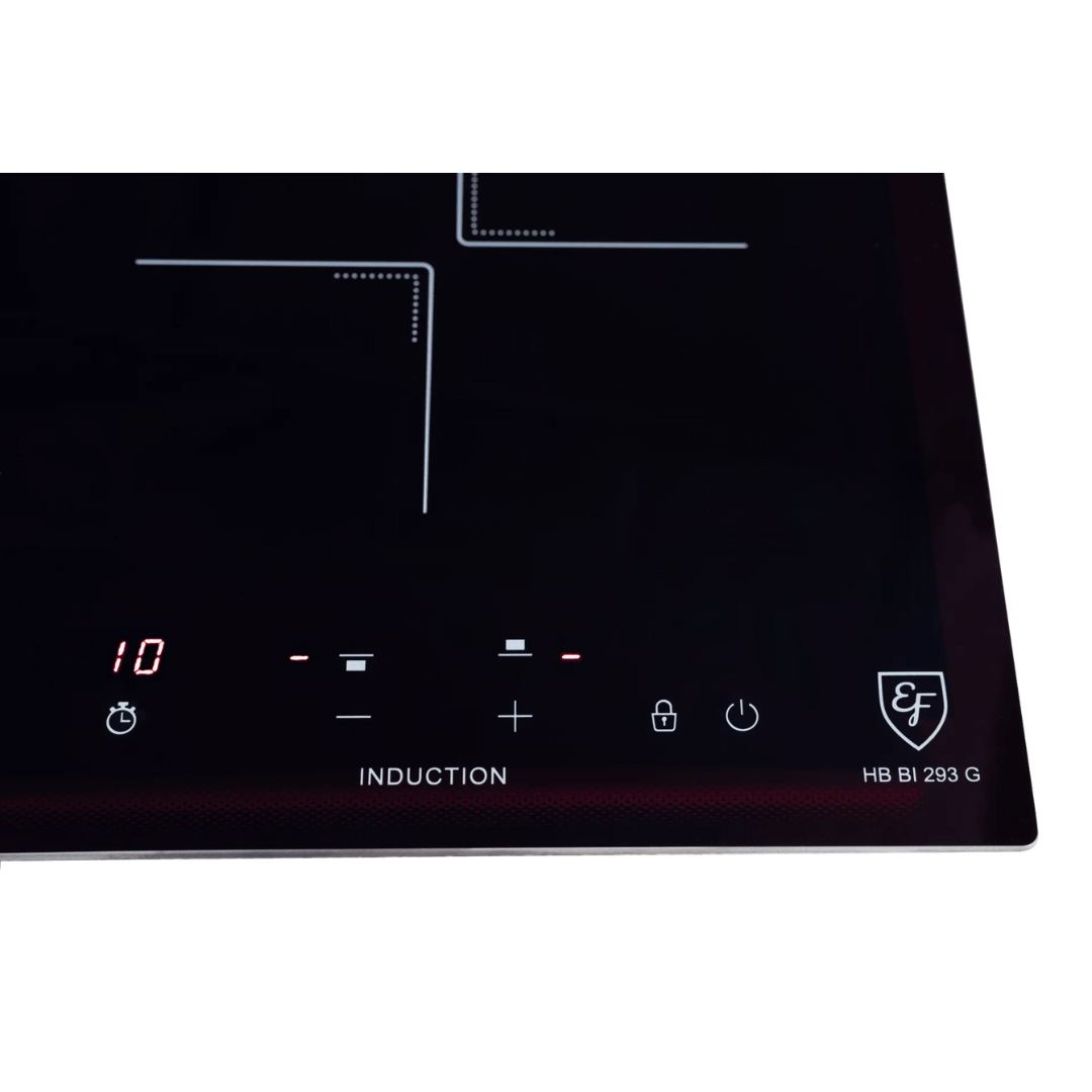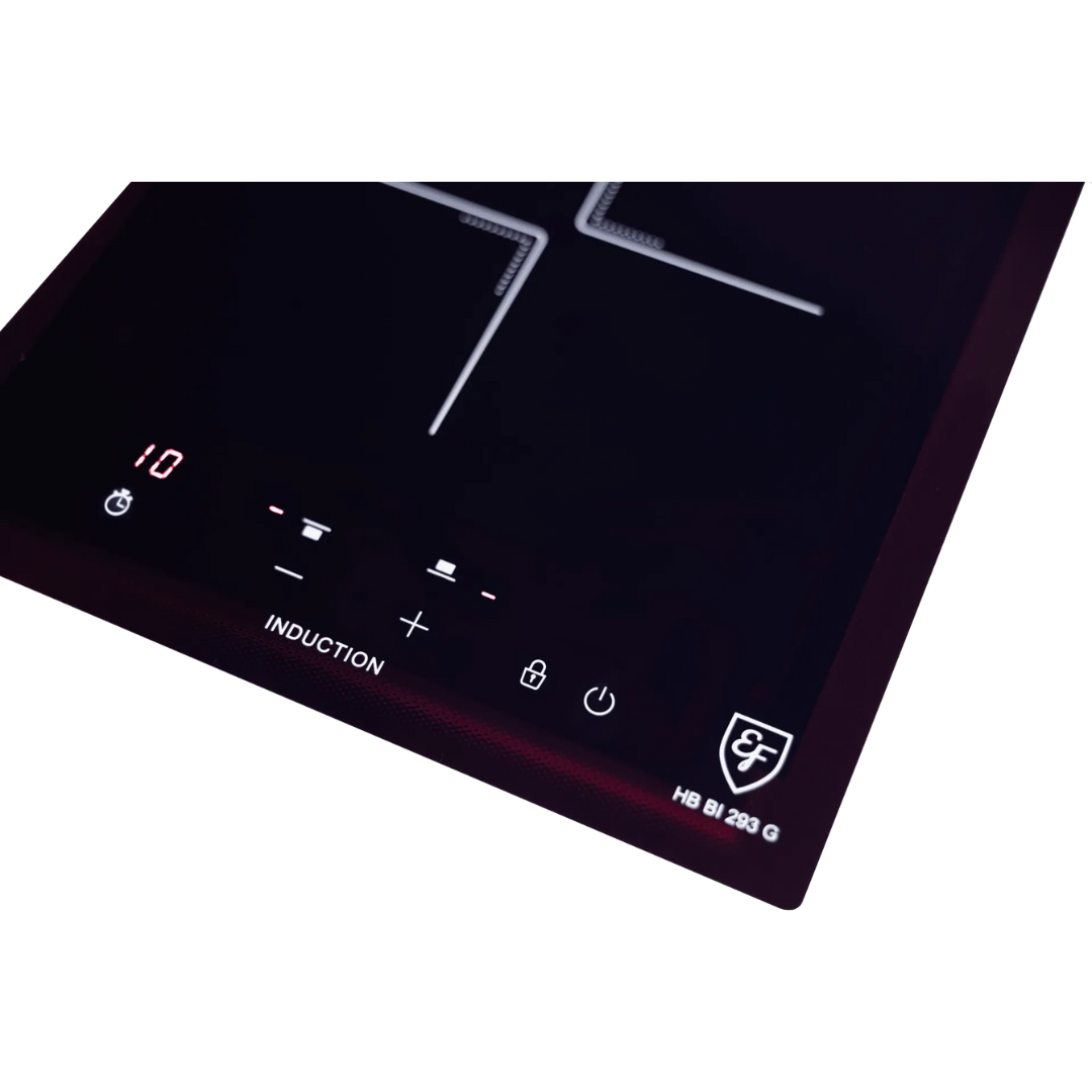 The EF HBBI293G 30cm Induction Hob combines sleek Italian ILVA® glass with advanced cooking technology in a compact design. Featuring two induction zones — 1.7kW front and 1.2kW rear — it delivers fast, precise, and energy-efficient heating. With sensor touch control, pan recognition, nine power levels, and a 99-minute timer, it offers full control for effortless cooking. Safety is built-in with features like overflow protection, residual heat indicators, child lock, and automatic switch-off. Perfect for modern kitchens, this 13A induction domino hob blends performance, safety, and style in one elegant appliance.