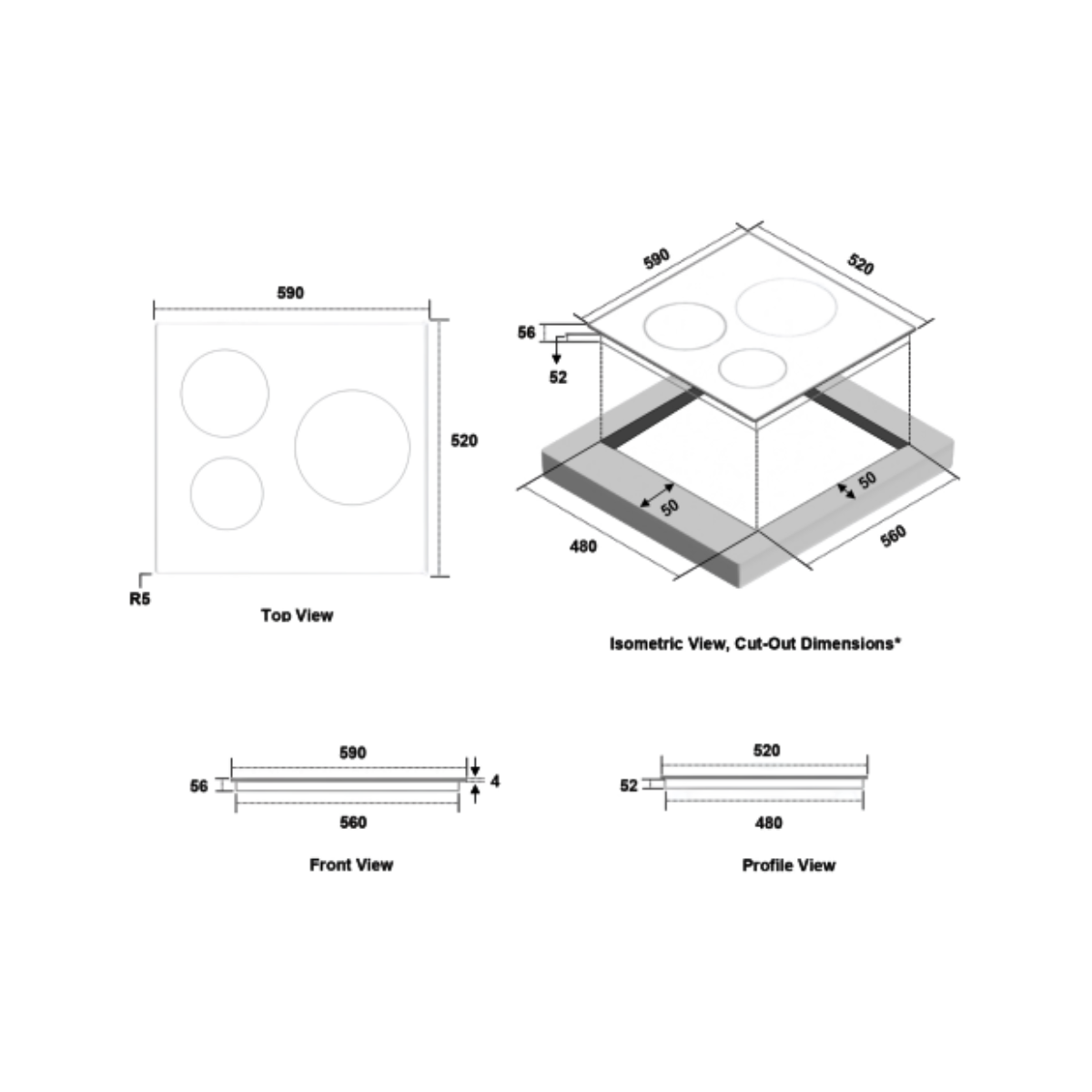Cut-Out Dimensions (WxD): 560-565 x 480-485mm