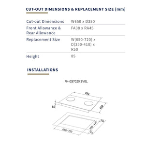 The Fujioh FH-GS7020-SVGL is a sleek and efficient 78 cm built-in 2-burner gas hob with a toughened black glass surface that brings both style and performance to your kitchen. It features a double inner flame burner for more even heat distribution and quicker cooking alongside a powerful ultra-rapid burner, giving you versatile heat control for everyday meals. With sectional flame control, a flame-failure safety device, battery-operated push-turn ignition, matt enamelled pan supports, and a heat deflector to protect controls, this hob combines safety, durability, and convenience in a compact design. Backed by a 1-year parts warranty and a lifetime warranty against toughened glass shattering, the FH-GS7020-SVGL is a dependable choice for modern home cooking.