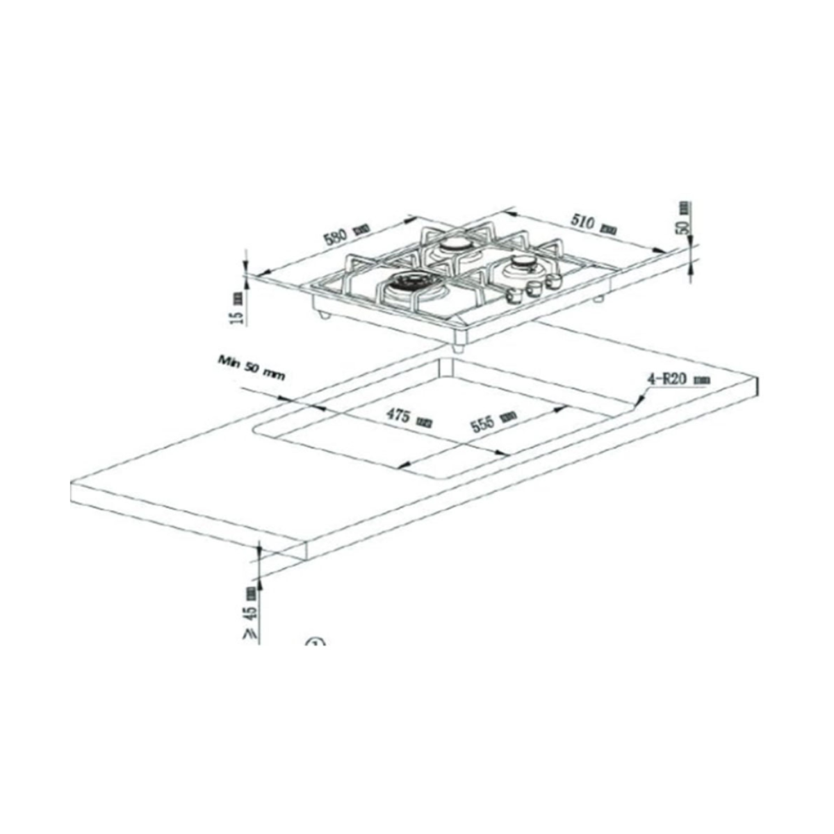 Cut-Out Dimensions (mm): 555 (W) x 475 (D) x 20 (R)
