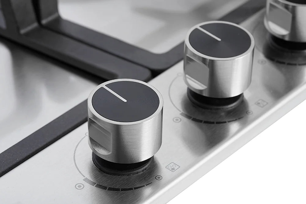 The Rinnai RB-63SSV-DL (DC) and RB-635SSV-DR (DC) is a 58cm 3-burner built-in hob featuring a sleek stainless steel top plate. Designed for compact spaces, it includes sealed burners, full surface cast iron pan supports, and a stylish front knob control panel, offering both convenience and contemporary kitchen appeal.