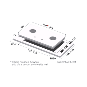The Rinnai RB-782G 78cm 2 Burner Built-In Glass Top Plate offers a sleek, modern design with a flexible cut-out for easy installation. Features include simmer control, double-ring sealed burners, safety devices, and a battery ignition system. It also includes a universal adapter for woks and small pots, and durable matte enamel pan support.
