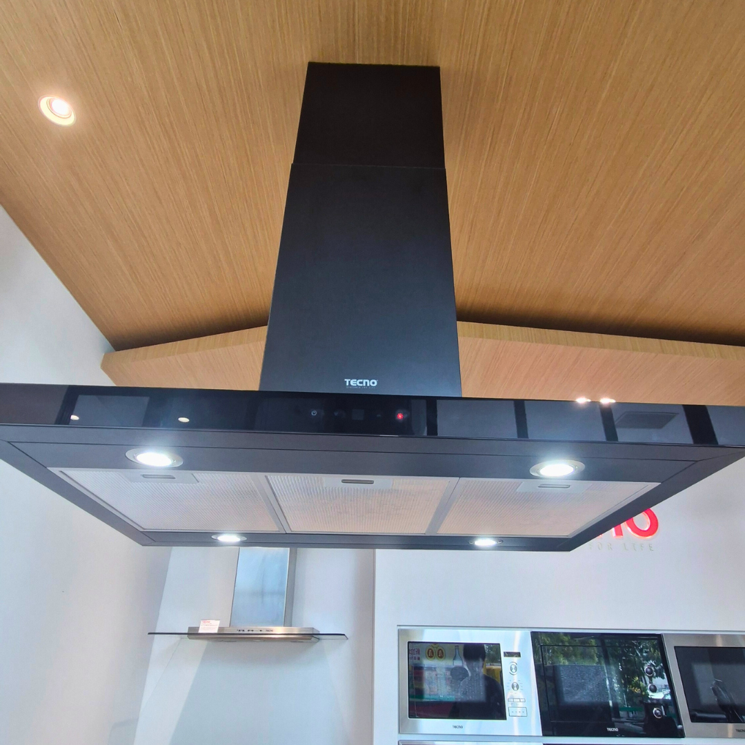 This island kitchen hood offers strong suction power of up to 1100m³/h for effective fume extraction. With 4-speed electronic sensor touch controls, it allows for easy operation. The washable 3-ply aluminum filters efficiently remove grease, while the cassette charcoal filters tackle odors for a fresh cooking environment. Equipped with 4 x LED down lights, it provides bright illumination, and the minimalist matte black body adds a sleek, modern touch. Operating at a low noise level of less than 62db, it ensures a quiet cooking experience.