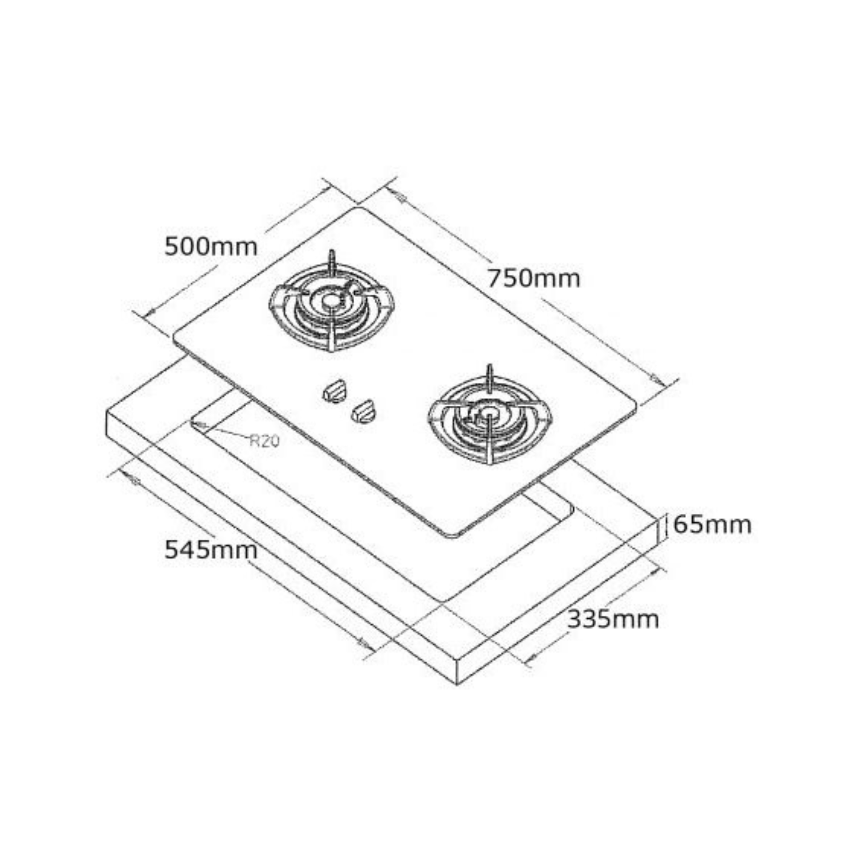 Cut-Out Dimensions (WxDxH): 545mm x 335mm x 65mm