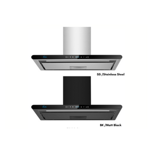 Turbo's 90cm T-ultra slim Chimney Hood, in SS or Matt Black, features sensor touch controls with 3-speed settings. It includes a motion sensor for adjusting speed by waving your hand. It comes with a removable and washable aluminium wide metal filter for grease trapping, two round charcoal filters for reducing cooking odors, bright and energy-saving LED lamps, and an AC motor for high airflow and durability.