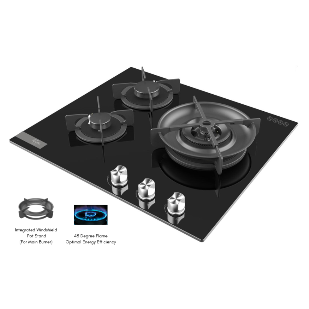 Turbo T6603GV 58cm Built-In Glass Gas Hob combines style and performance with three powerful burners, including a 4.5kW main burner with integrated windshield. Crafted with SUS304 stainless steel, it features a flame failure device, cast iron pot stand, and battery ignition—ideal for efficient, safe, and modern kitchen cooking.