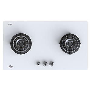 The 88cm Built-In Glass Hob with 2 Burners boasts a 4.2kW double ring wok burner and a rapid burner, both equipped with inner ring control devices for precise cooking. It features copper alloy burners with safety valves, a durable cast iron pot stand, and a built-in battery-operated ignition system. The hob is complemented by alloy laser coating control knobs and a premium SCHOTT glass surface.