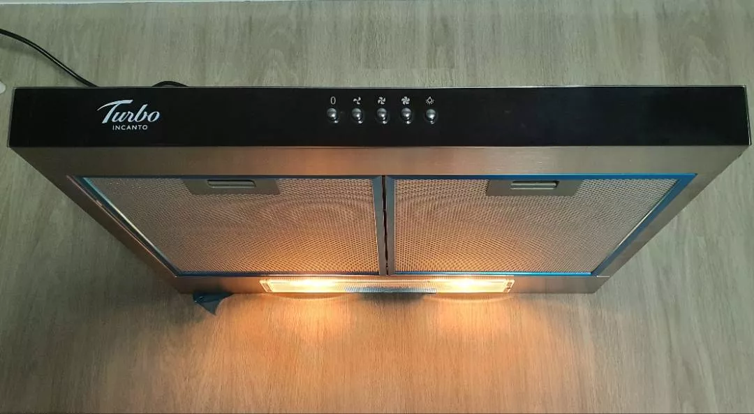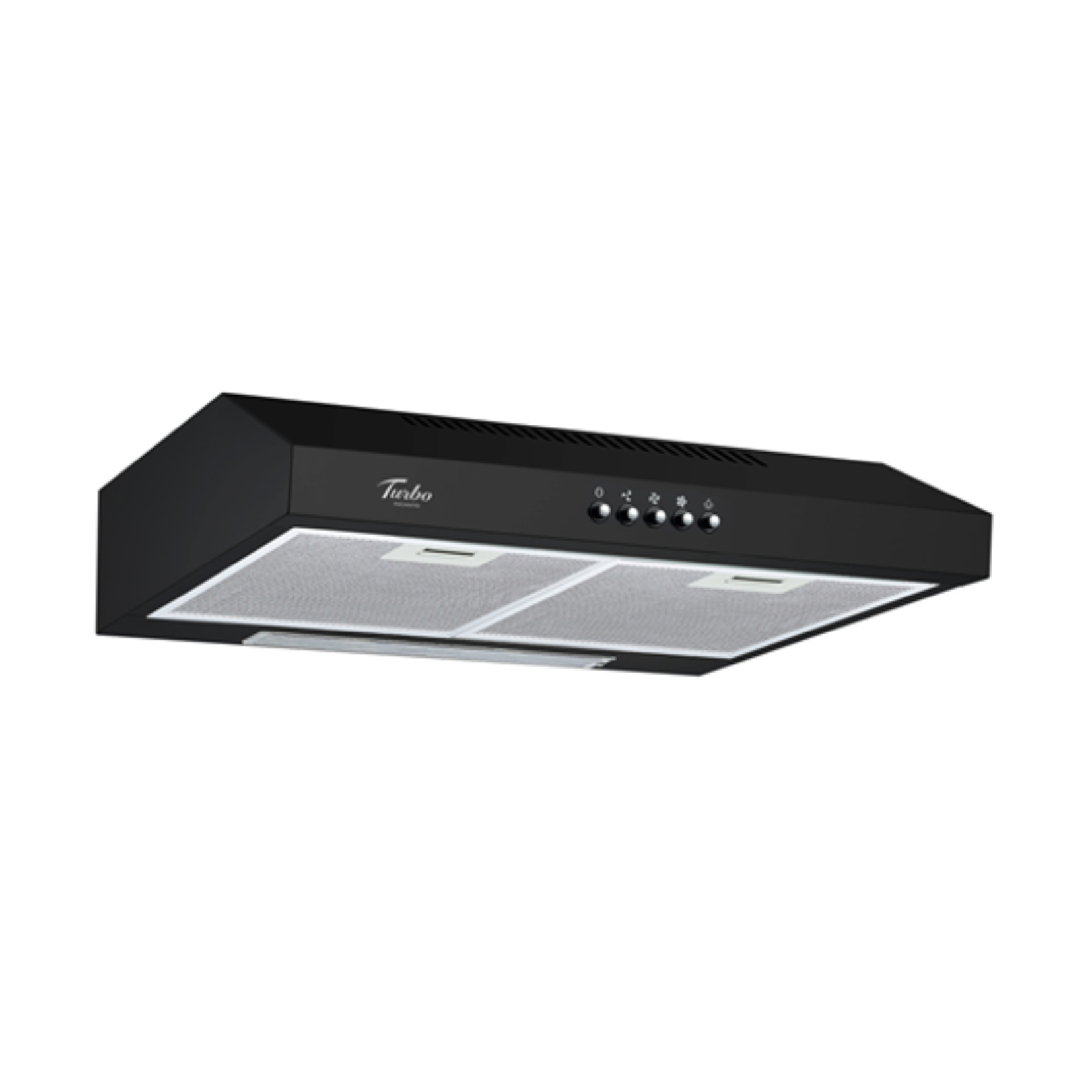 The Turbo 60cm Conventional Hood features a sleek flat control panel with black glass, a washable metal grease filter, and an airflow capacity of 500m³/hr, ensuring effective and stylish kitchen ventilation.