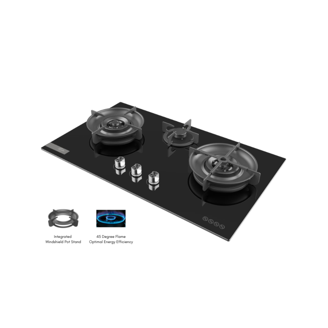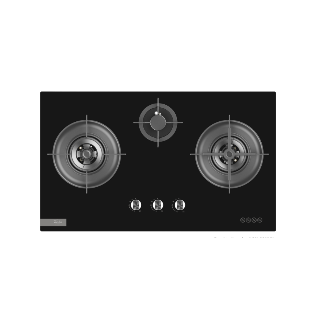Introducing the Turbo TC333GV, an 86cm built-in black glass gas hob with 3 burners—two 4.2kW burners and one 1.2kW auxiliary. Made with durable tempered glass, it features alloy burners with FFD, cast iron pot stands with windshields, and battery-operated ignition.