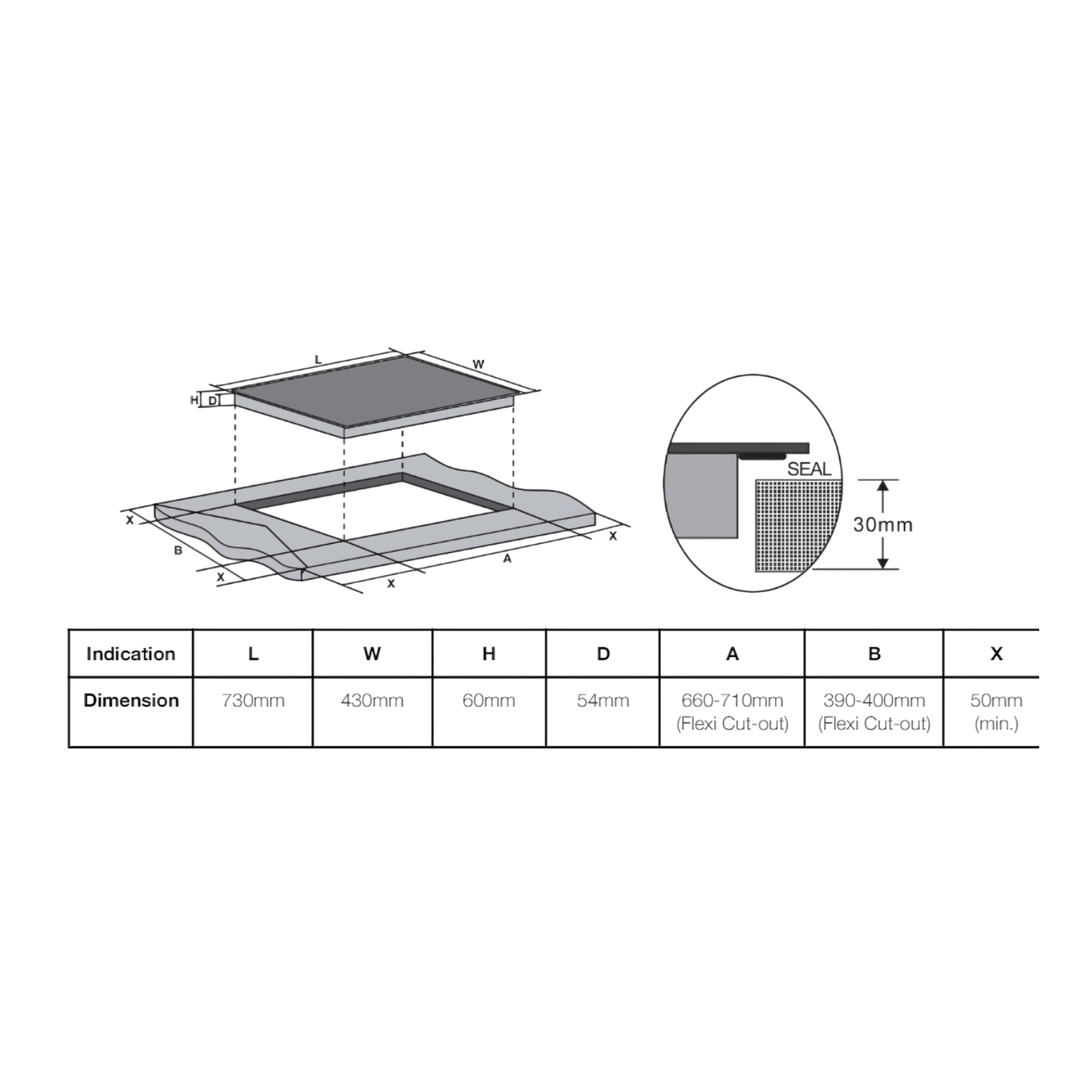 Cut-Out Dimensions (WxD): 660-710mm x 39-430mm